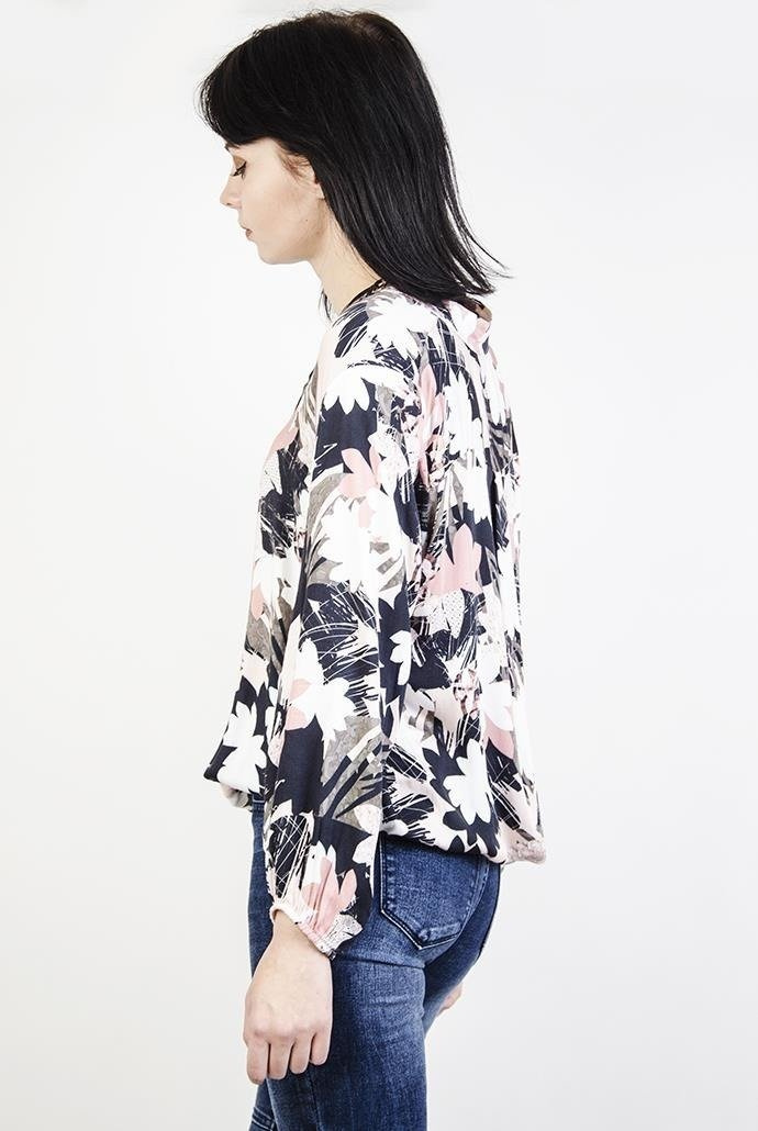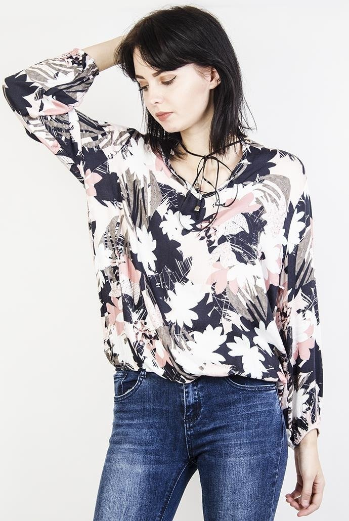 Bluzka w motyw kwiatowy, z wiązaniem w dekolcie. Posiada gumkę przy rękawie oraz na dole.