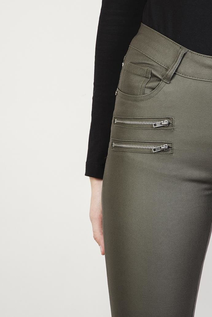 Zielone spodnie skórkowe z trzema srebrnymi zamkami.