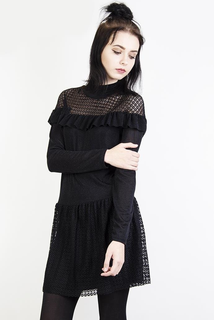 Czarna sukienka z falbanką przy dekolcie oraz ażurowymi wstawkami.