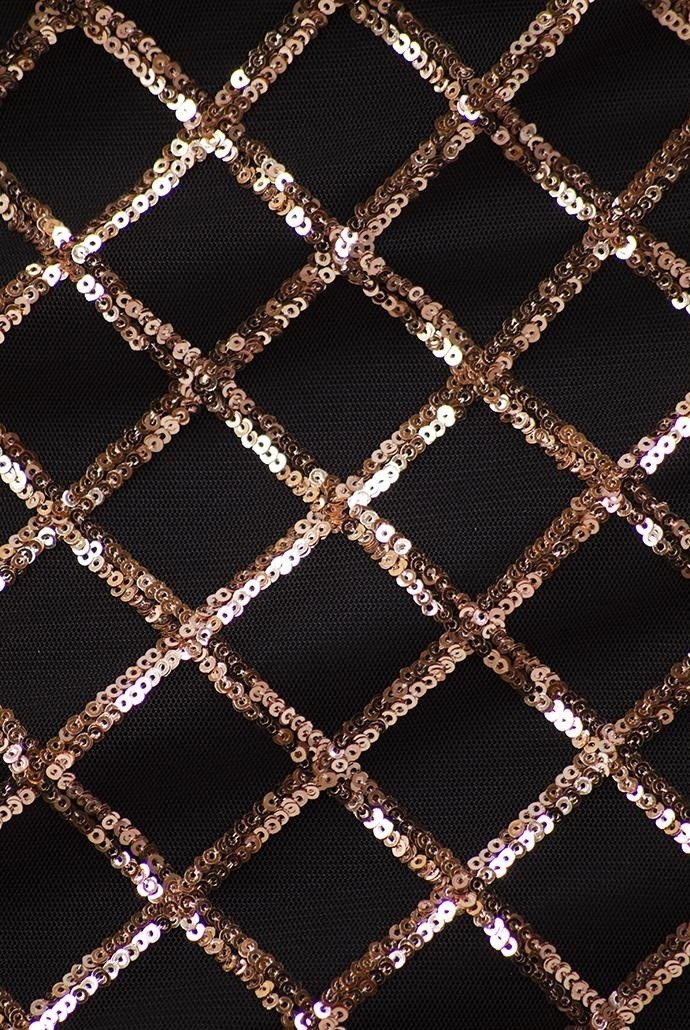 Czarna sukienka ze złotymi cekinami. Posiada ściągacz w talii oraz przy rękawach. Pasek dołączony do sukienki jest odpinany.