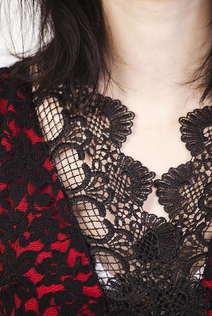 Przylegająca czarno-czerwona sukienka z koronkowymi wstawkami.