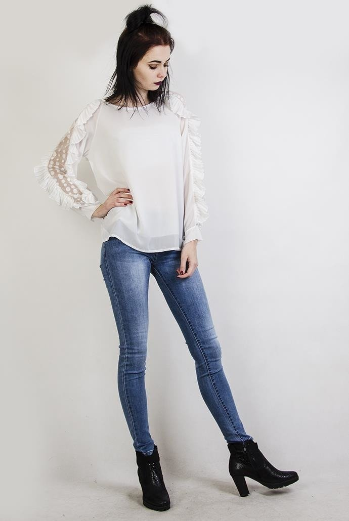 Biała bluzka koszulowa z falbankami przy rękawach.