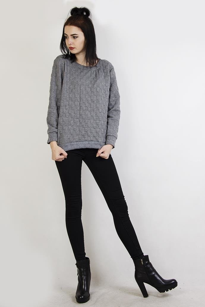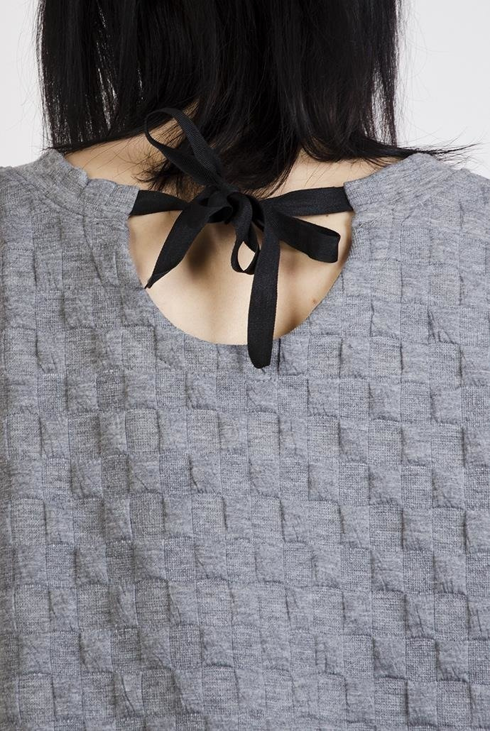 Jasnoszara bluza w wytłaczany, kwadratowy wzór z wiązaniem z tyłu.