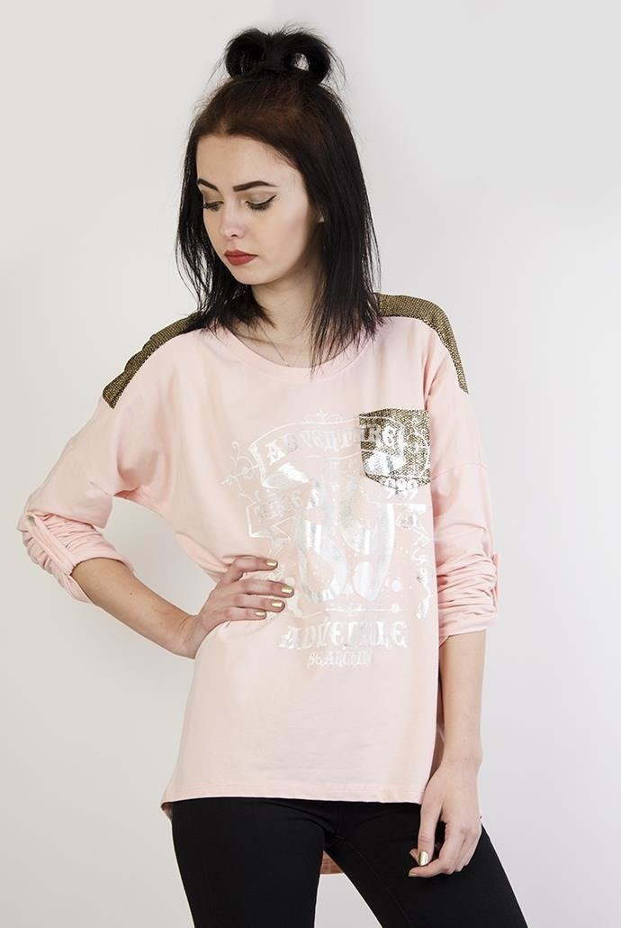 Jasnoróżowa bluzka z nadrukiem i złotymi elementami. Posiada guzik do podwinięcia rękawa.