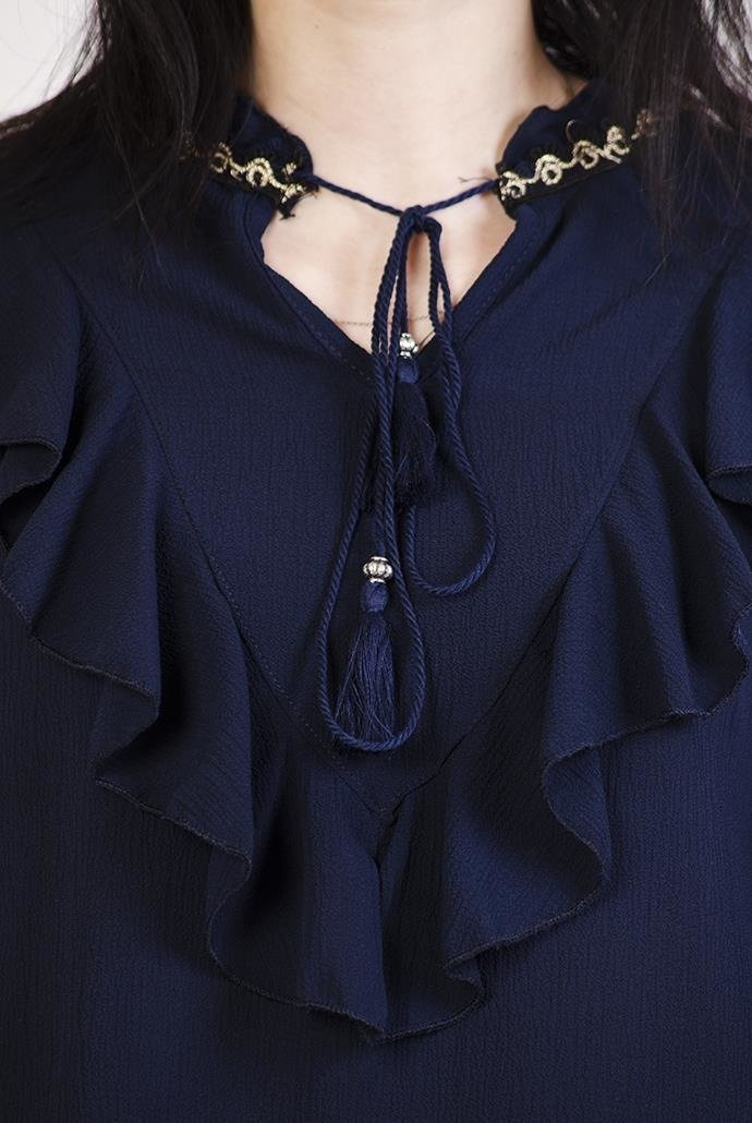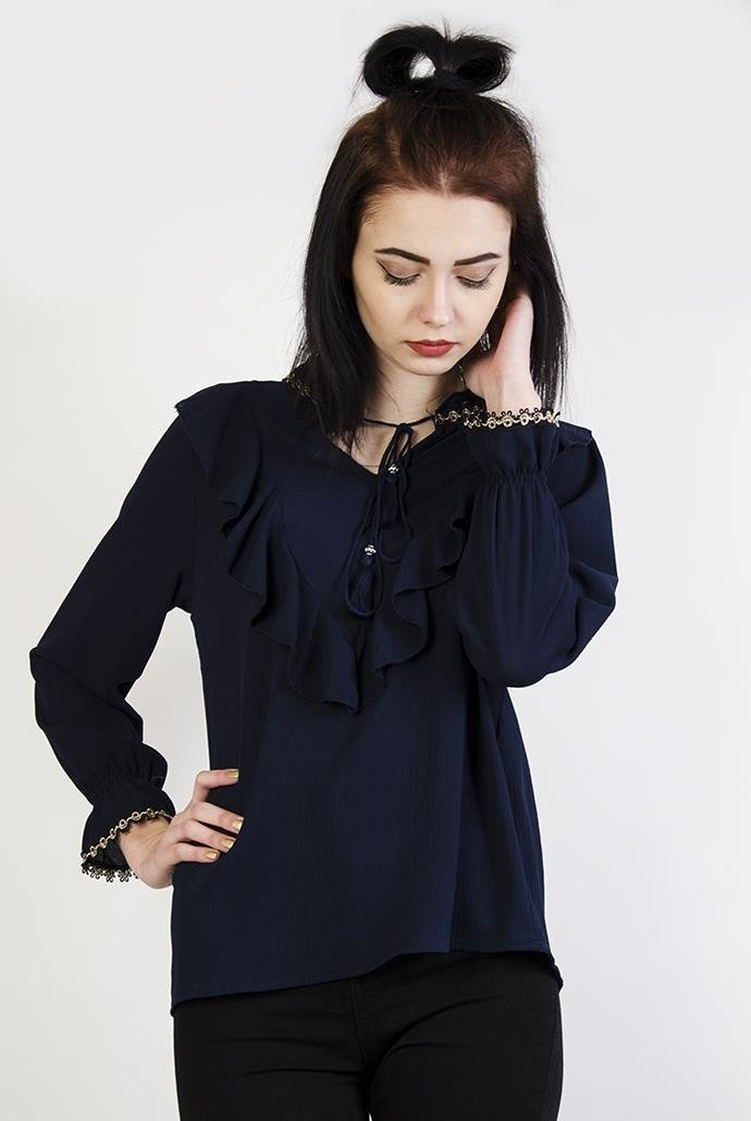 Granatowa bluzka z falbanką i wiązaniem przy szyi. Posiada gumkę przy rękawie oraz złote obszycia.