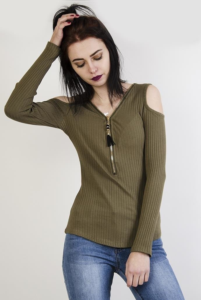 Zielona prążkowana bluzka z odkrytymi ramionami zapinana na zamek