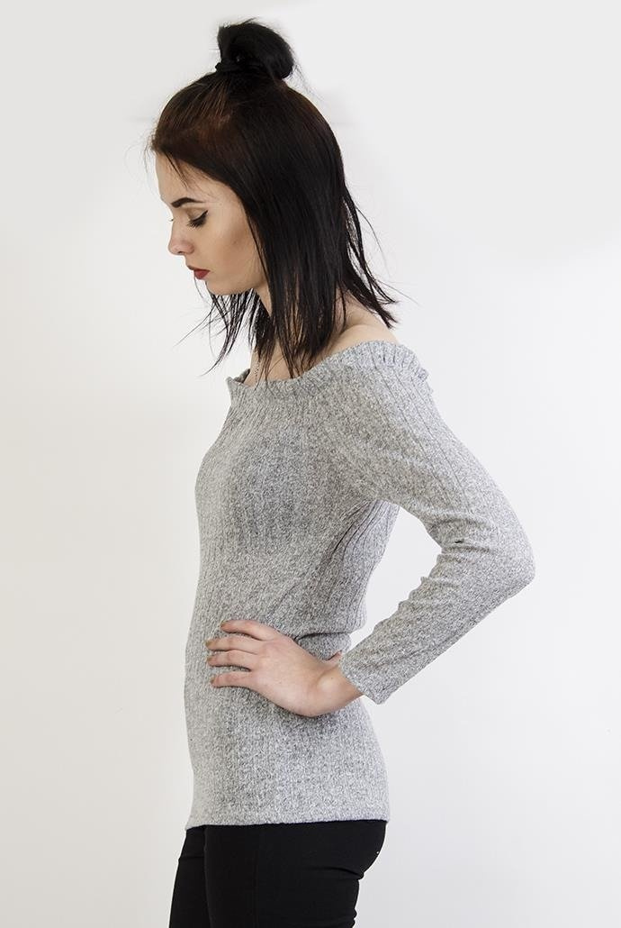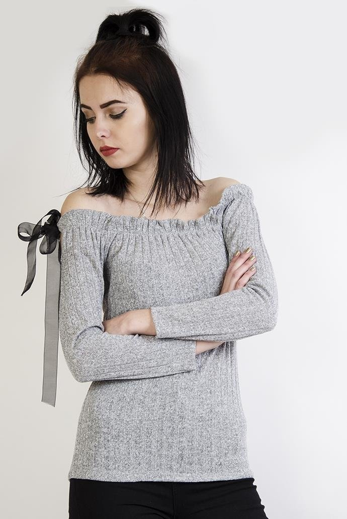 Szara prążkowana bluzka z odkrytymi ramionami wiązana czarną wstążką