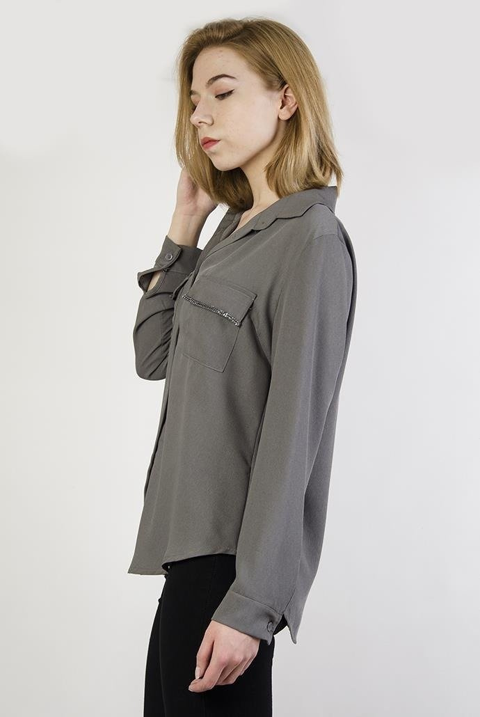Szara koszula z cyrkoniami przy kieszonce.