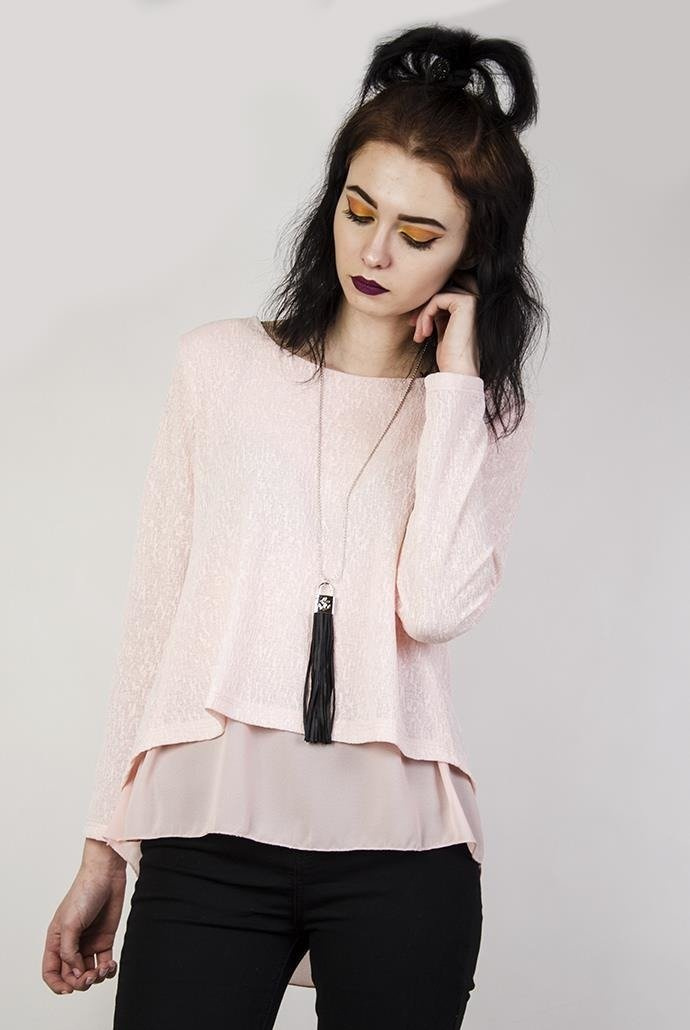 Jasnoróżowa asymetryczna bluzka z wisiorkiem kłódką w zestawie, posiada szyfonowe przedłużenie.