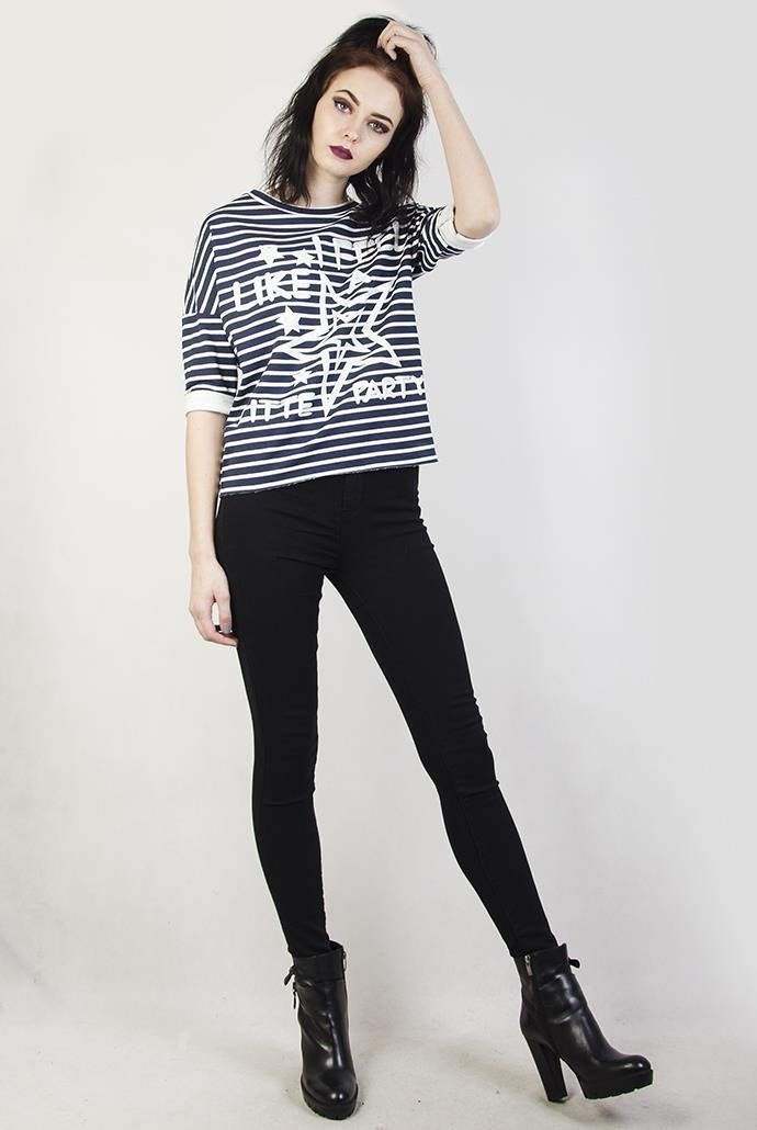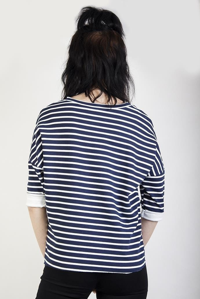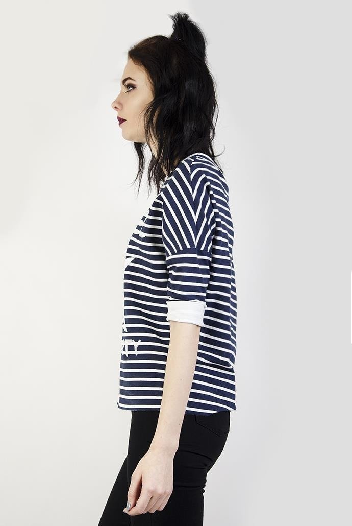 Bluzka w biało-granatowe paski, z nadrukiem. Posiada możliwość odwinięcia rękawa.