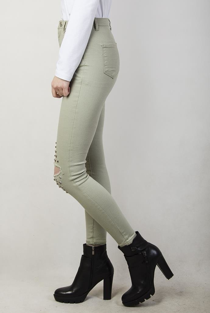 Jasnozielone spodnie skinny jeans z ćwiekami i dziurami. Posiadają wysoki stan.