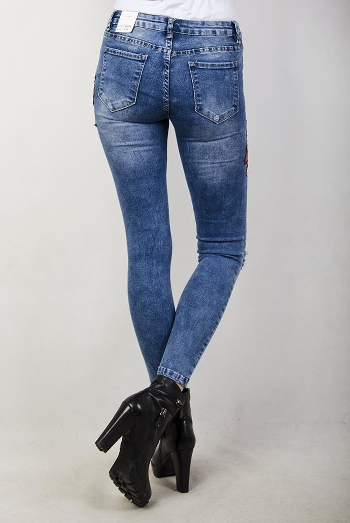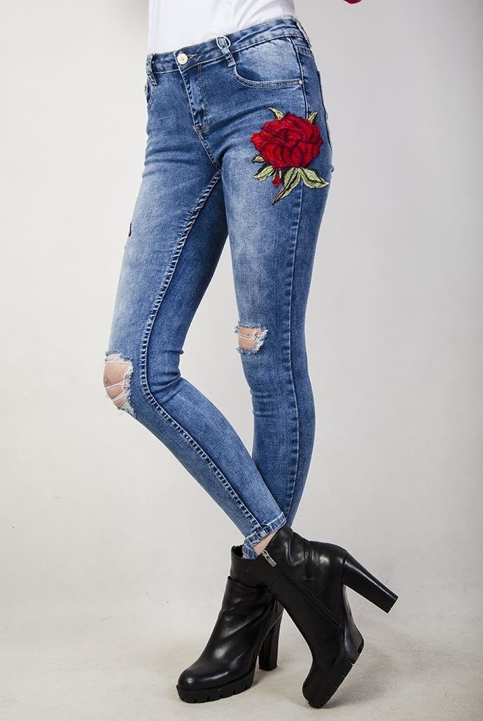 Spodnie jeansowe z naszywkami różami i wysokim stanem