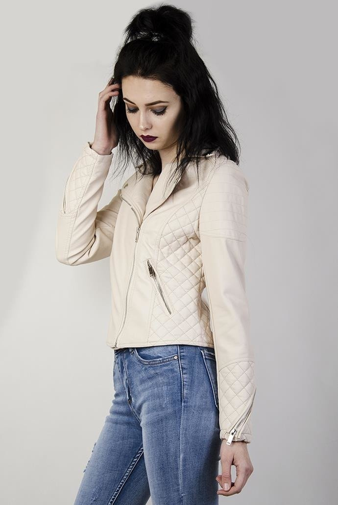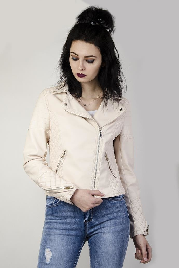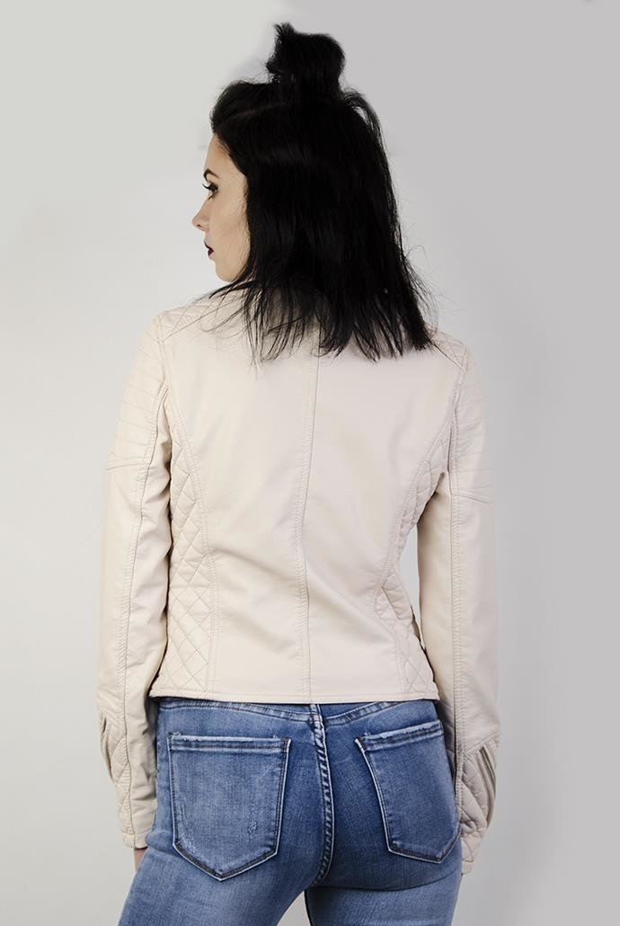 Beżowa kurtka ramoneska z zamkami, wykonana z ekoskórki.