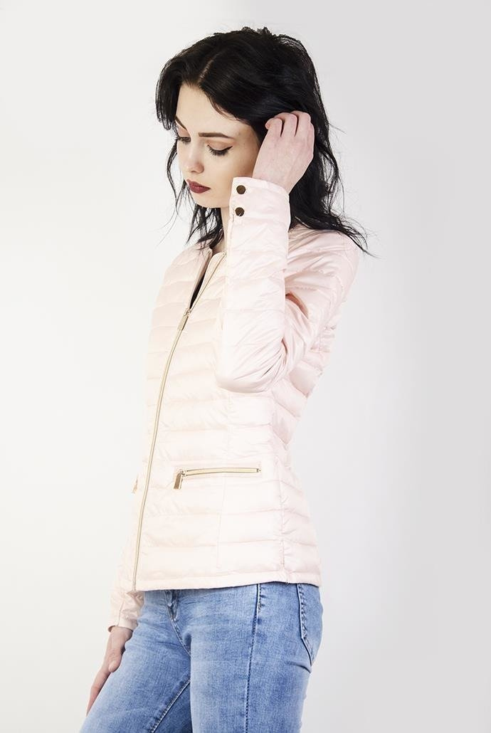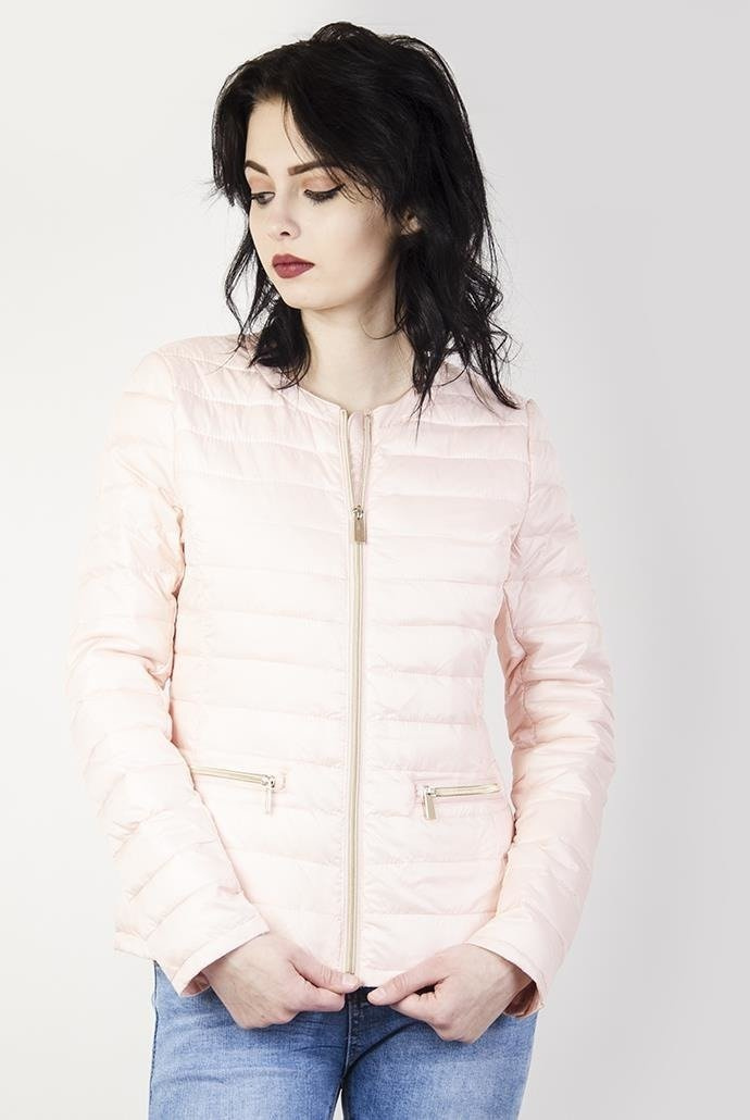 Jasnoróżowa kurtka pikowana z zamkami przy kieszeniach.