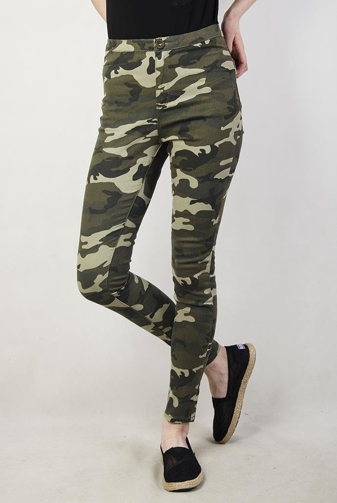 Spodnie moro z gumką w pasie i wysokim stanem.