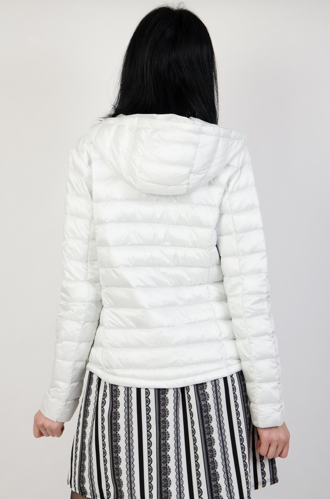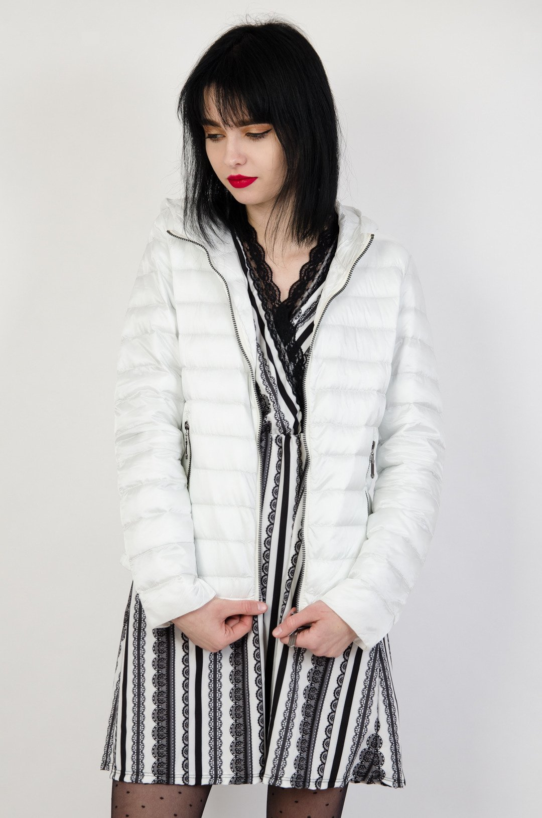 Biała kurtka pikowana, ze srebrnymi zamkami
