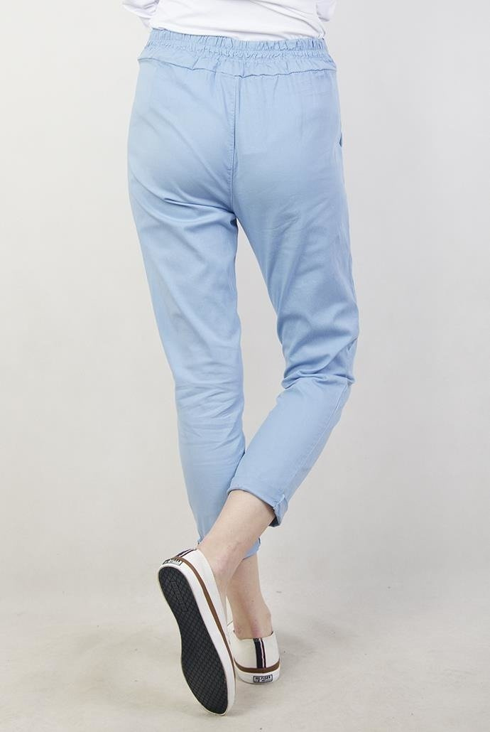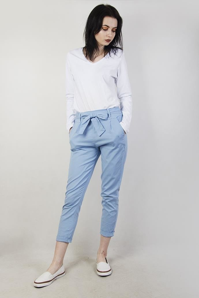 Niebieskie spodnie materiałowe z kokardą w pasie.