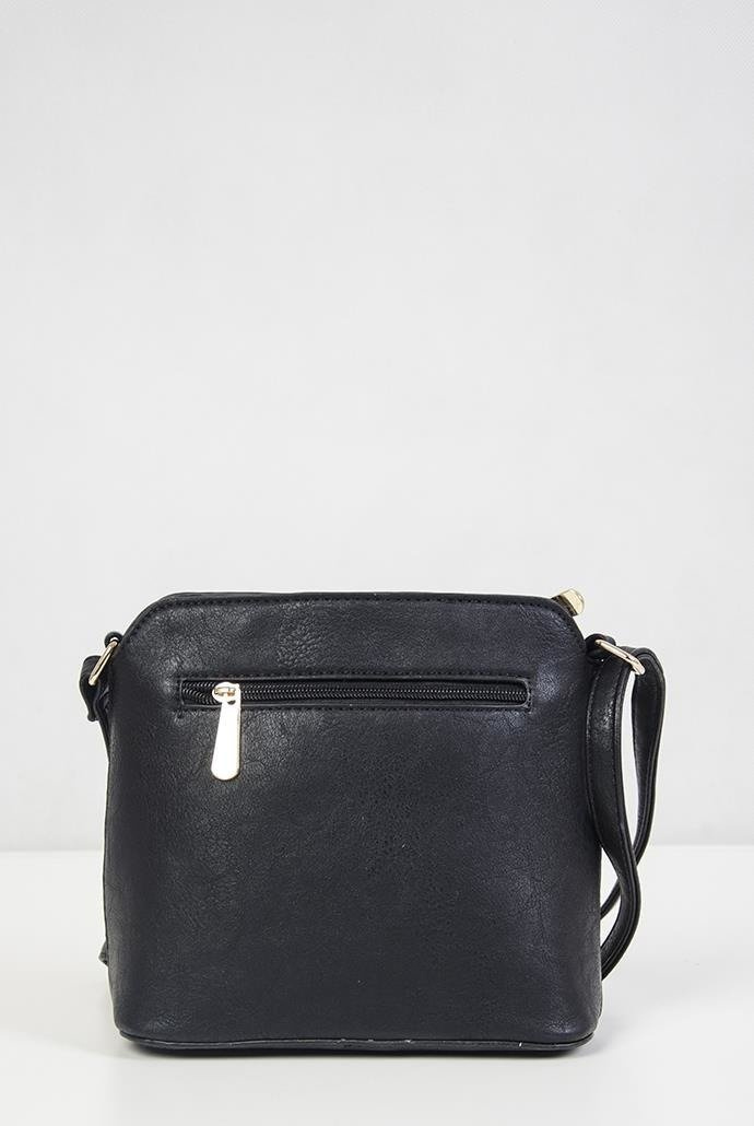 Mała, czarna torebka z ćwiekami po bokach. Posiada regulowany pasek. W środku przegródki na klucze czy portfel.