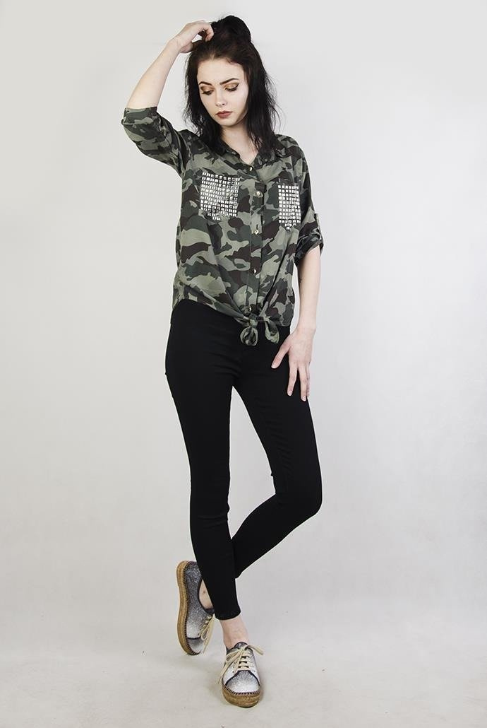 Koszula moro z wiązaniem na dole i ćwiekami przy kieszonkach.