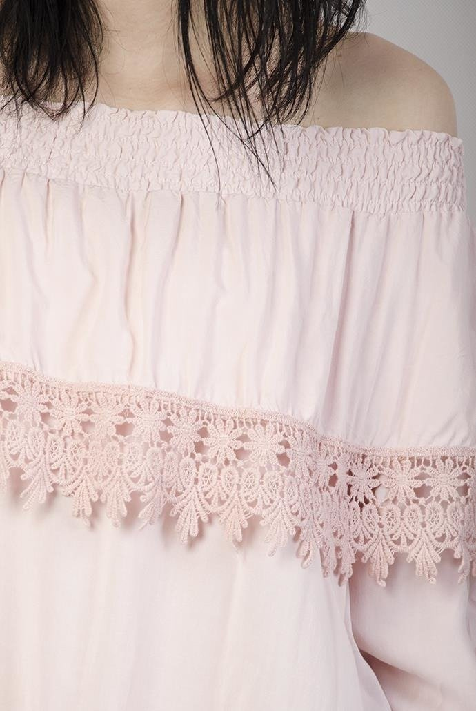 Jasnoróżowa przedłużana bluzka z falbaną przy dekolcie