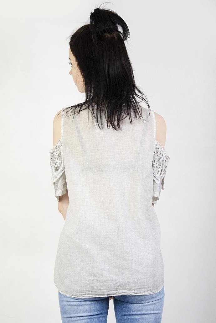 Szara bluzka z wyciętymi ramionami i ażurowym zdobieniem