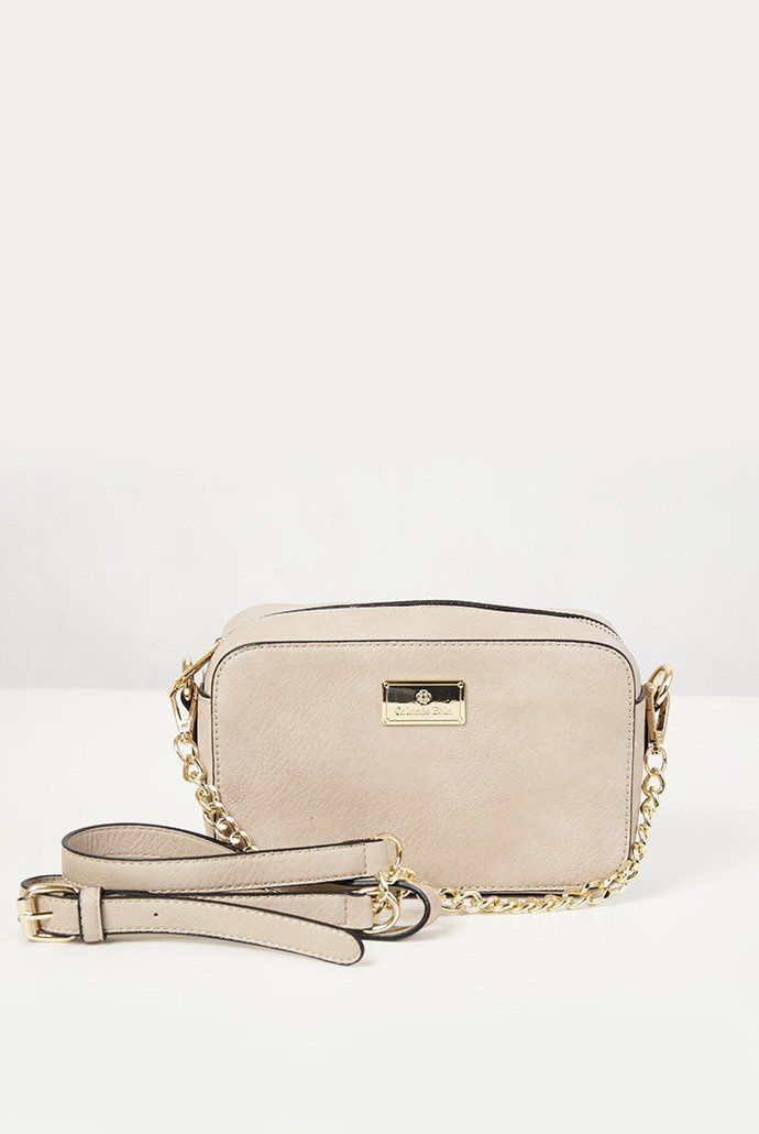 Beżowa usztywniana torebka na łańcuszku. Posiada możliwość regulacji długości paska.