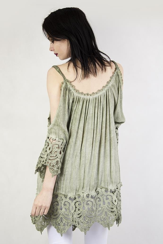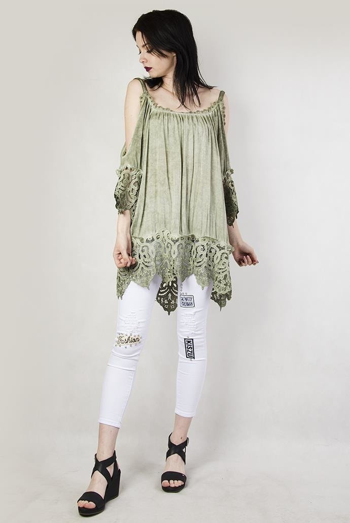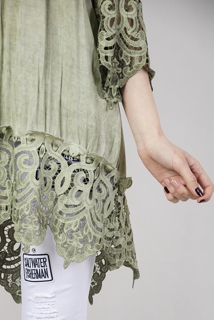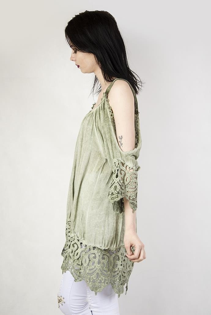Zielona bluzka z ażurowymi wstawkami i odkrytymi ramionami.