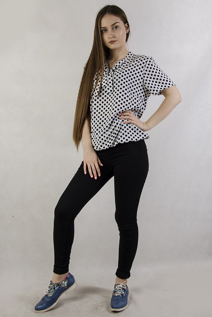 Biała bluzka w kropki z wiązaniem w dekolcie, posiada gumkę na dole.