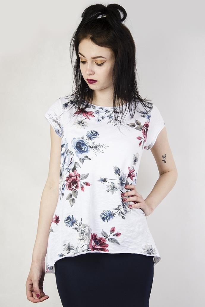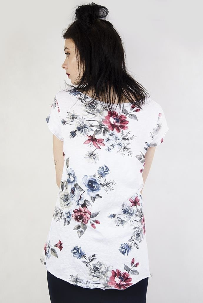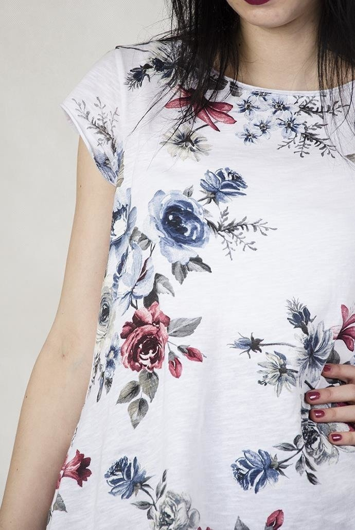 Biała bluzka w kwiaty, z krótkim rękawem.