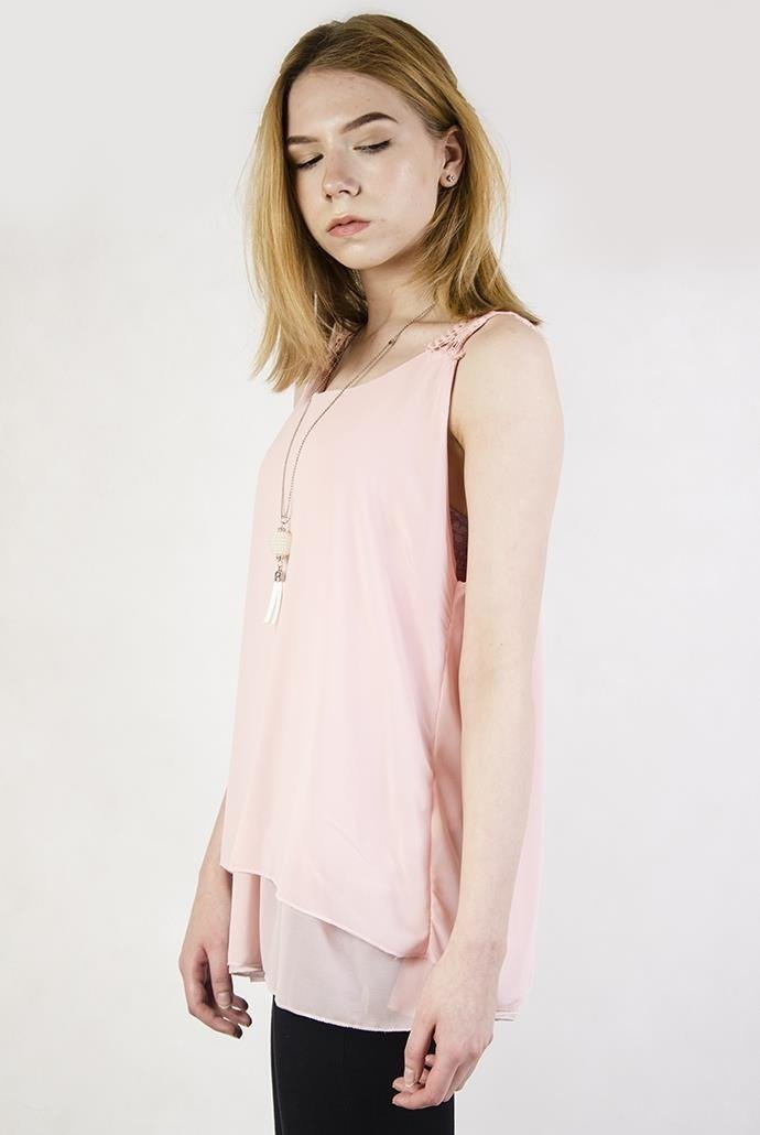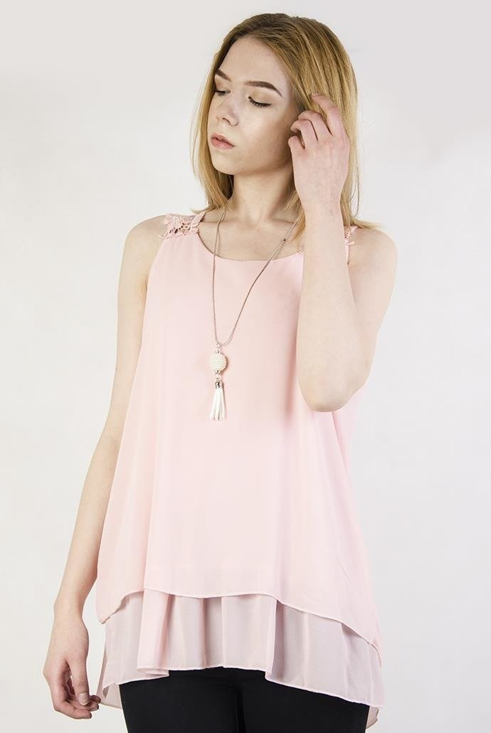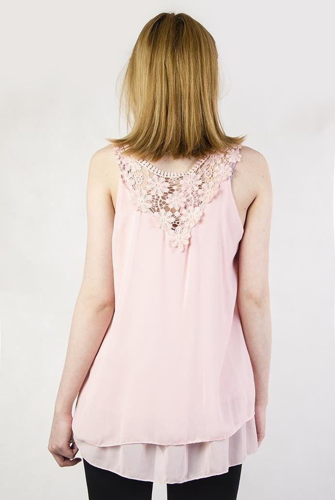 Jasnoróżowa bluzka z ażurowym zdobieniem z tyłu. Bez wisiorka