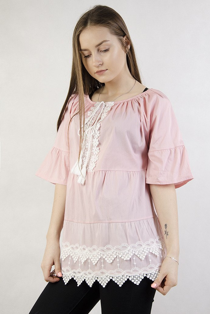 Jasnoróżowa bluzka koszulowa z haftami przy dekolcie.