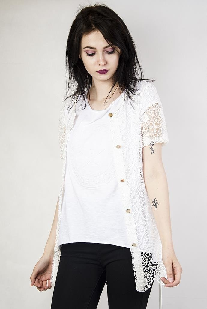 Biała ażurowa narzutka zapinana na guziki. Posiada wstążkę w pasie.
