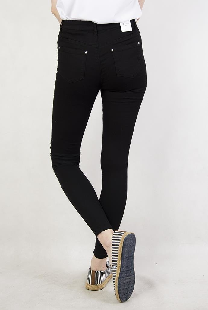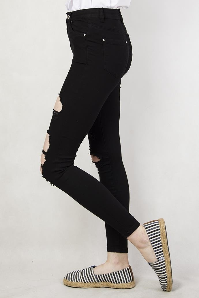 Czarne spodnie jeansowe z dziurami i wysokim stanem