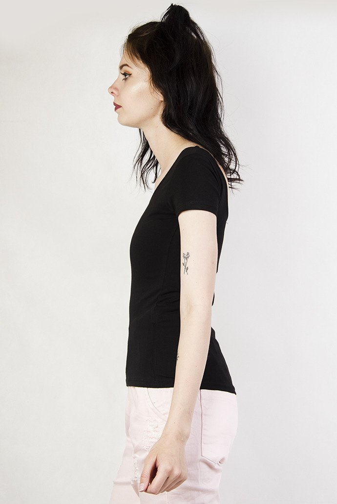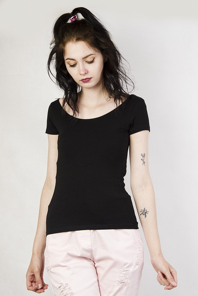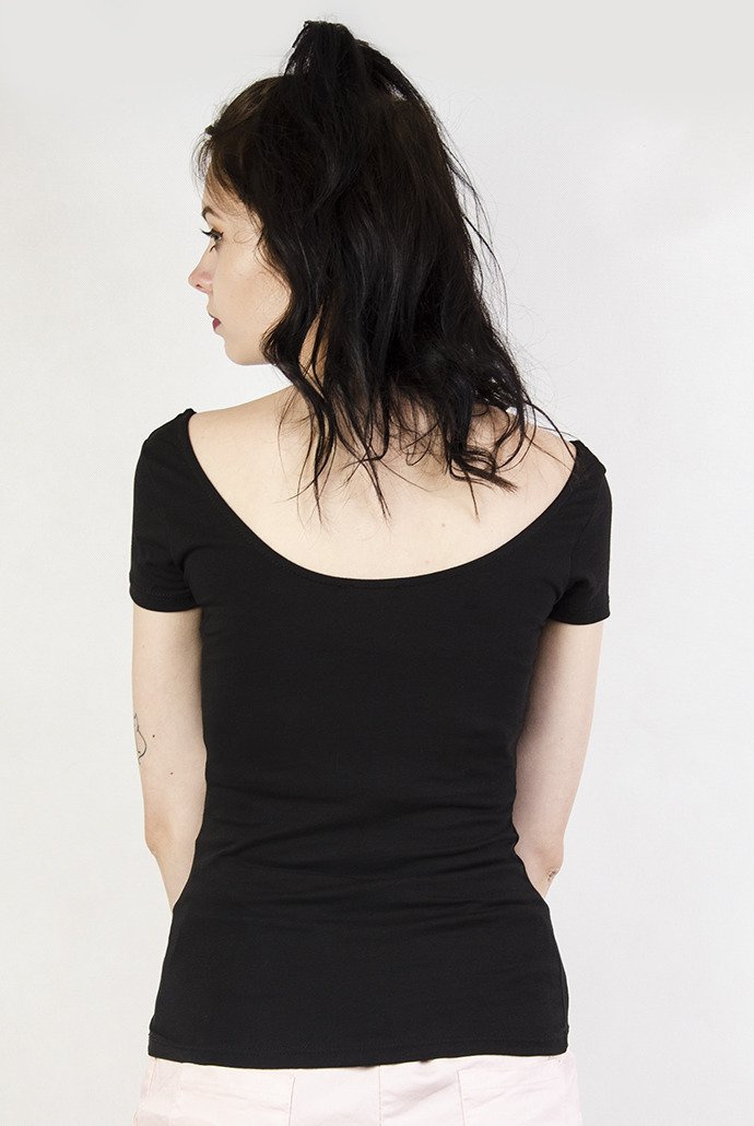 Czarna bluzka z dekoltem w łódkę oraz wycięciem na plecach