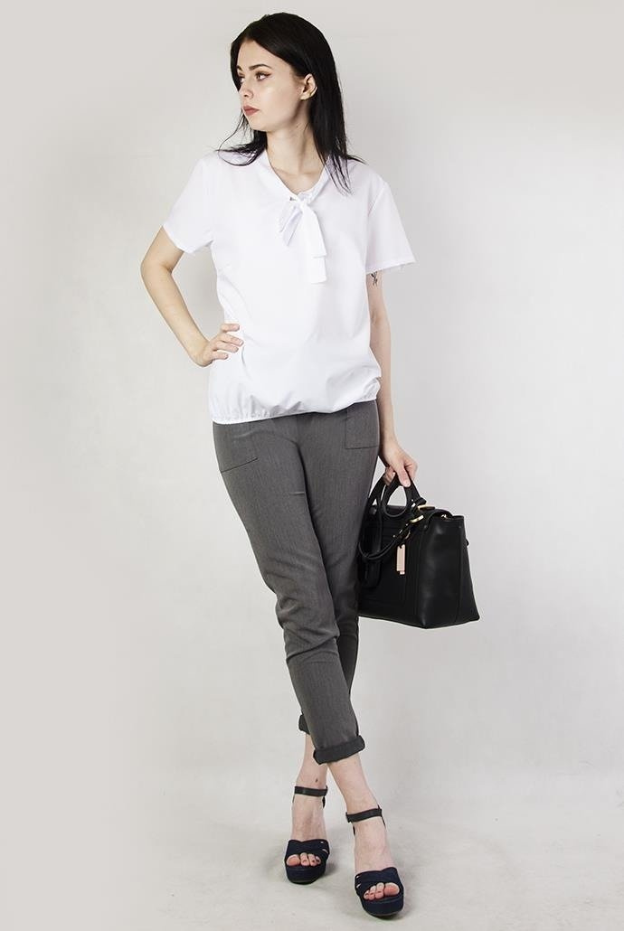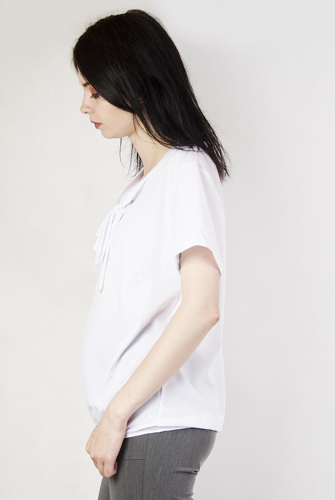 Biała, gładka bluzka koszulowa z wiązaniem przy dekolcie