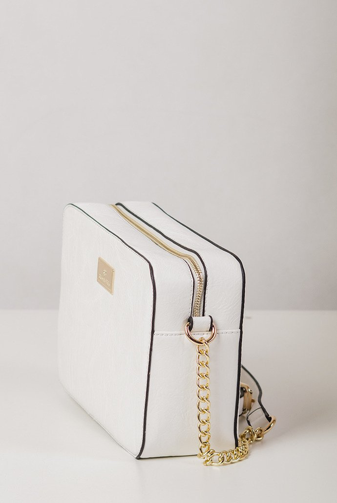 Kremowa, usztywniana torebka ze złotym łańcuszkiem, którego długość można regulować. W środku liczne przegródki na klucze czy portfel.