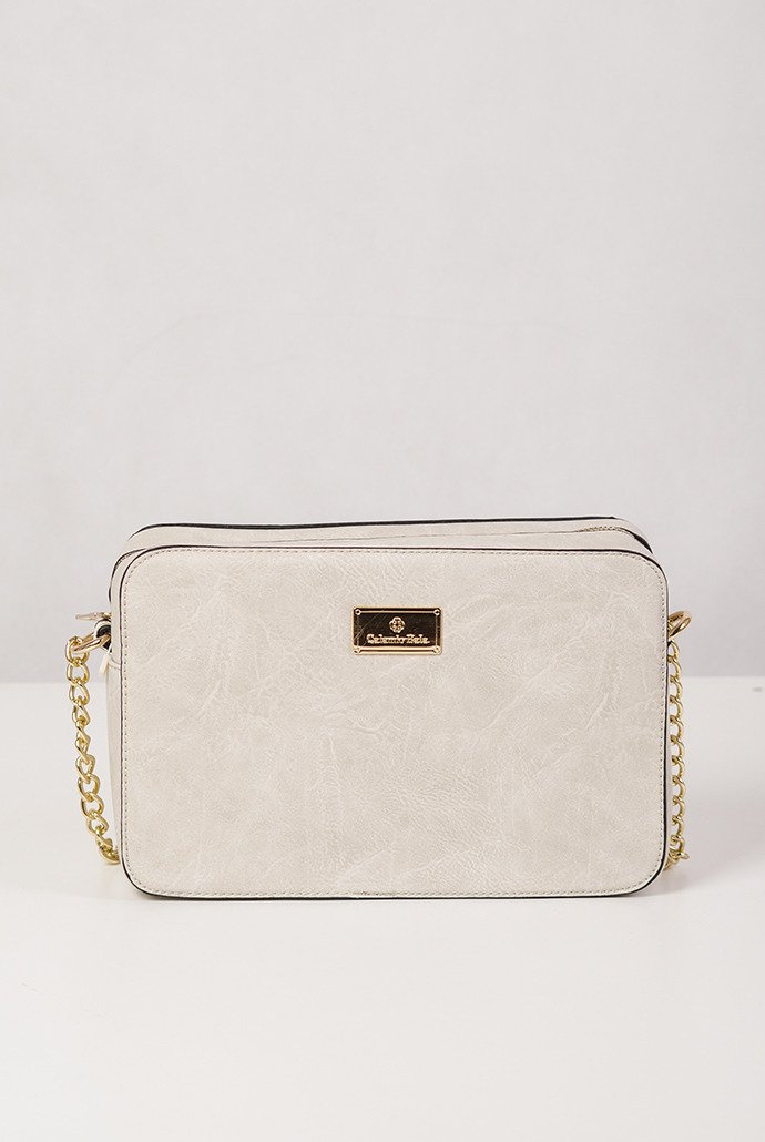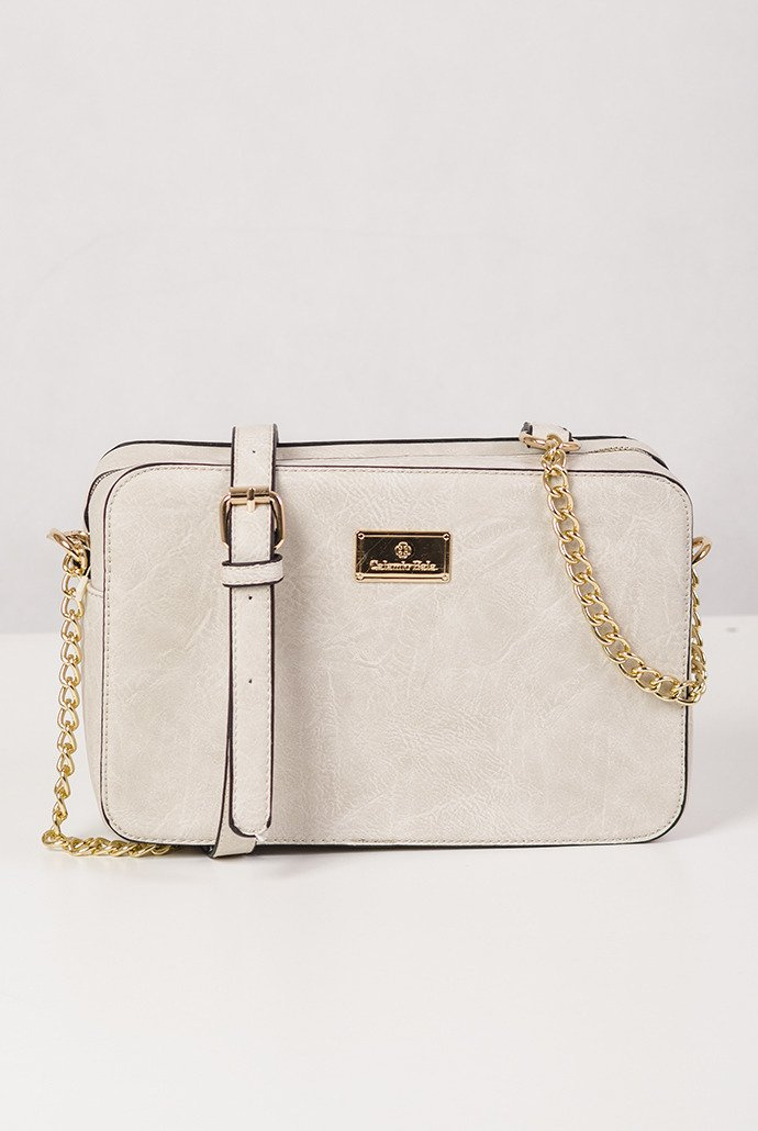 Beżowa, usztywniana torebka ze złotym łańcuszkiem, którego długość można regulować. W środku liczne przegródki na klucze czy portfel.