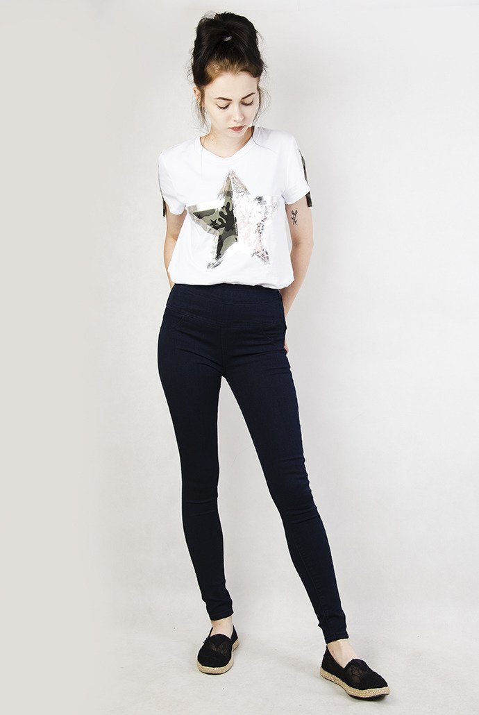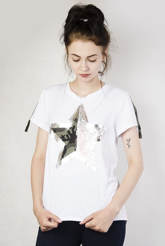 Biała bluzka z gwiazdą i moro paskami.