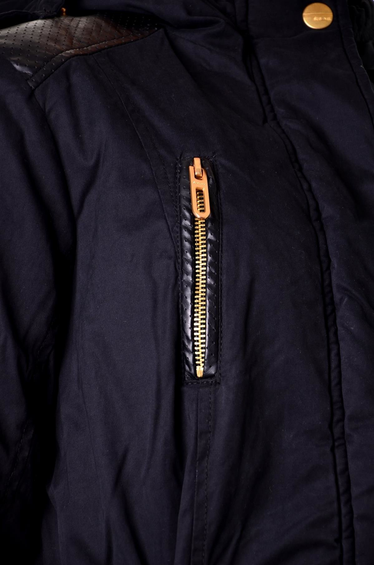 Ciepła kurtka z kapturem, oraz wstawkami skóry ekologicznej na ramionach, wiązana w talii. Rękawy wykończone skórą ekologiczną z ozdobnymi zamkami.
