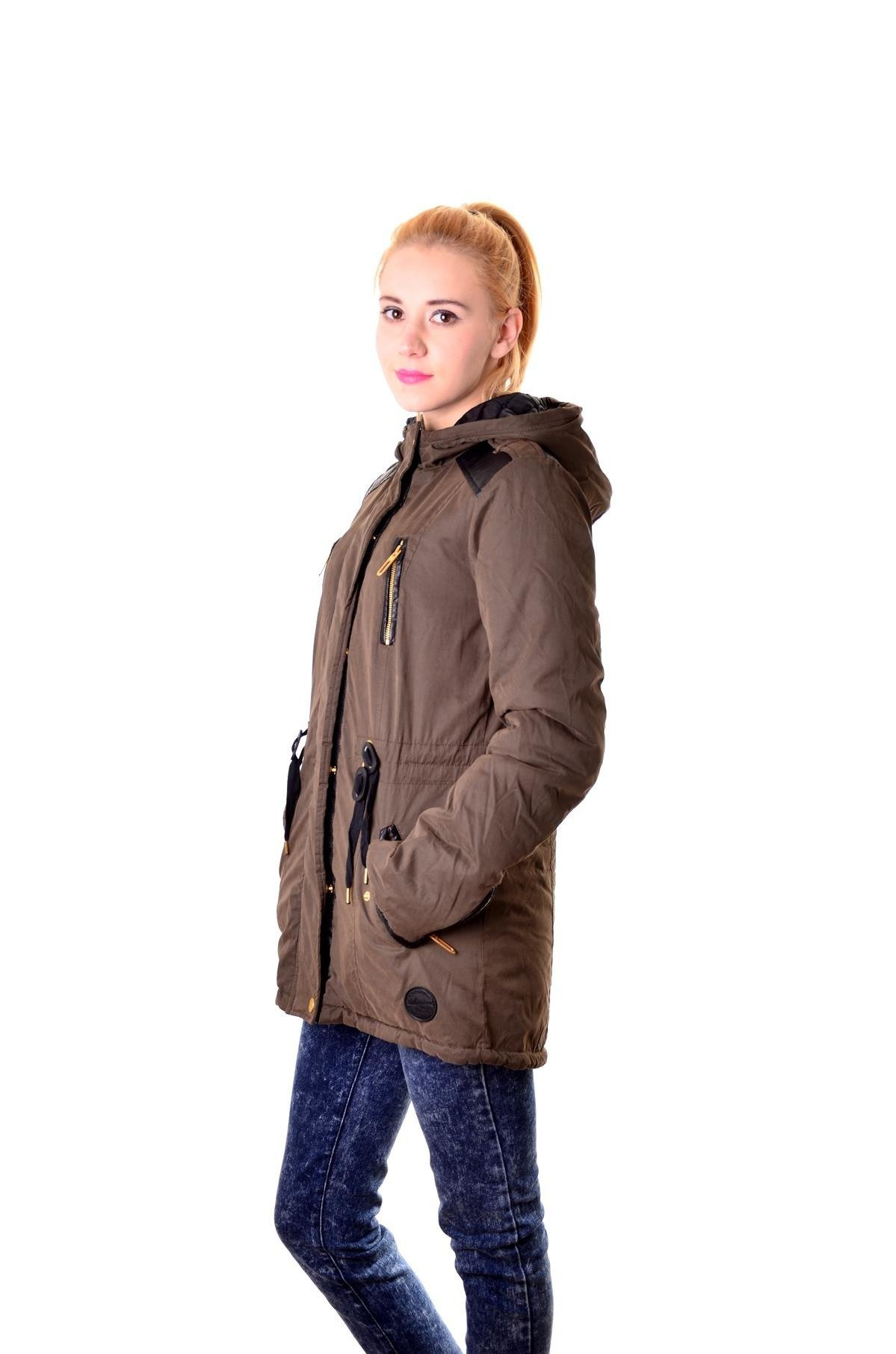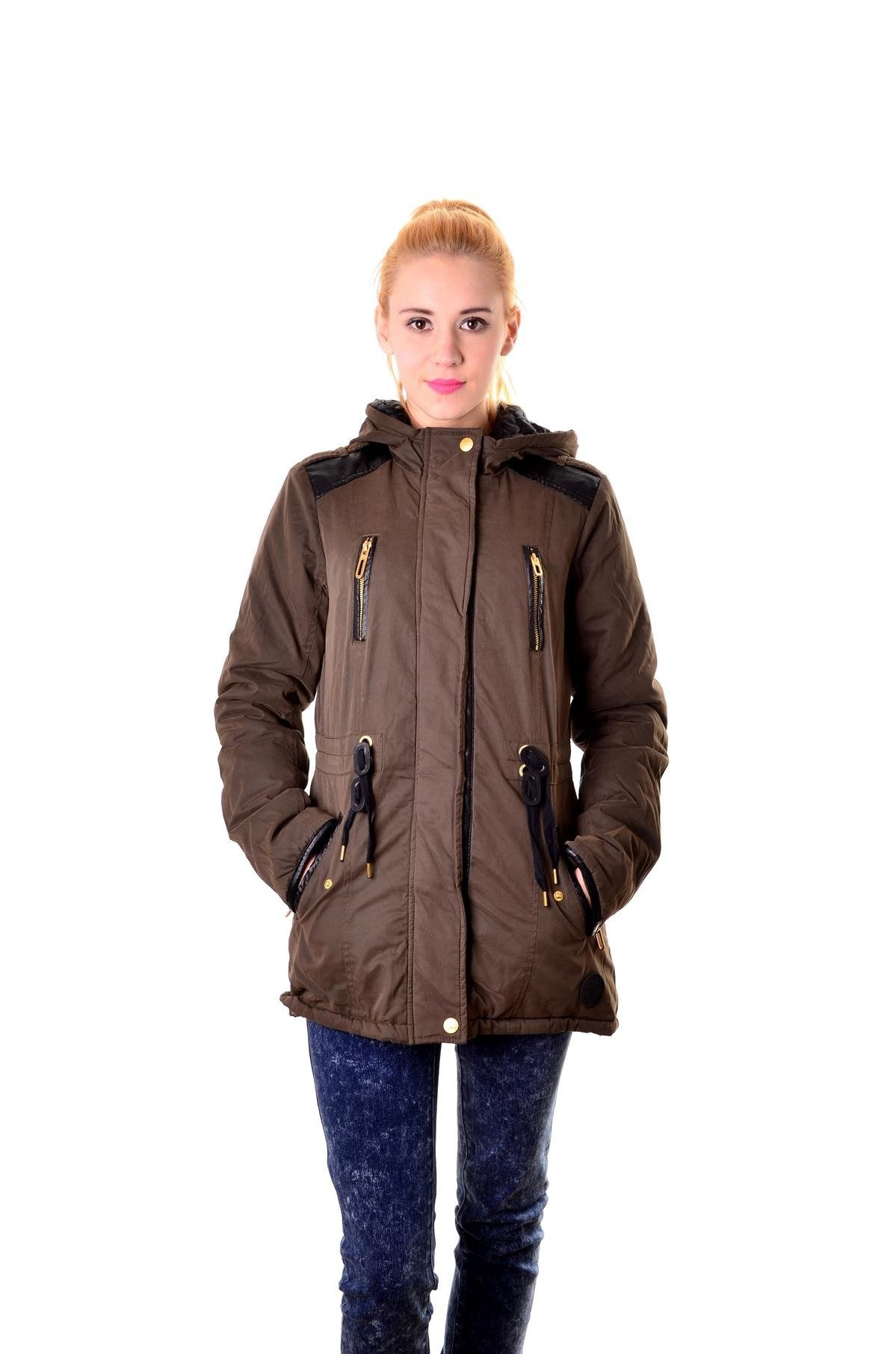 Ciepła kurtka z kapturem, oraz wstawkami skóry ekologicznej na ramionach, wiązana w talii. Rękawy wykończone skórą ekologiczną z ozdobnymi zamkami.