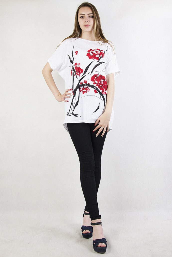 Biała, asymetryczna bluzka z czerwonymi akcentami