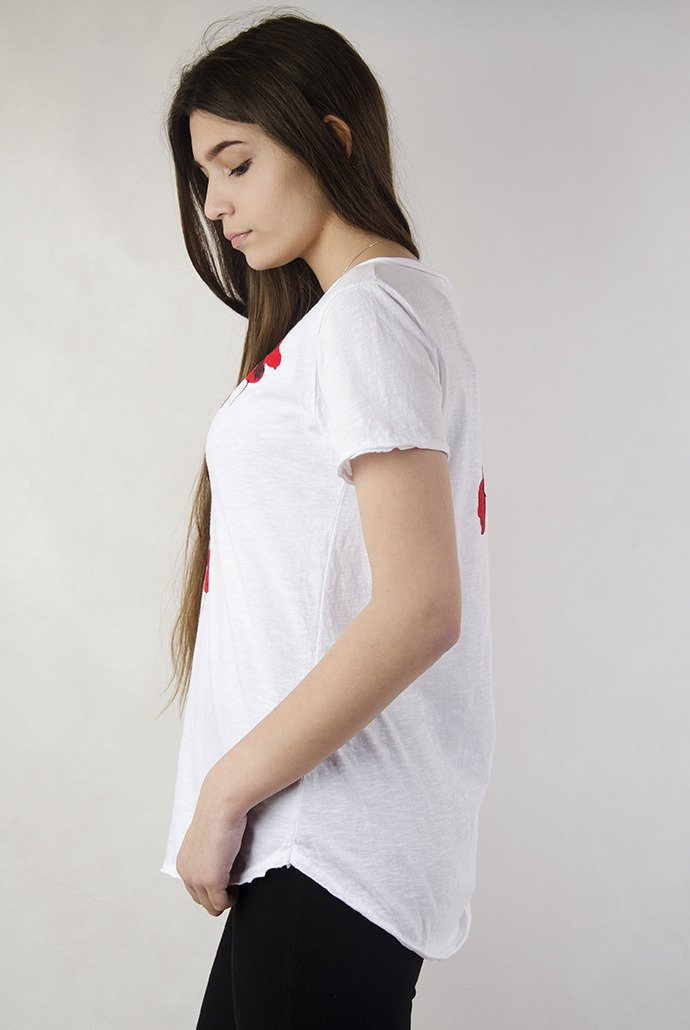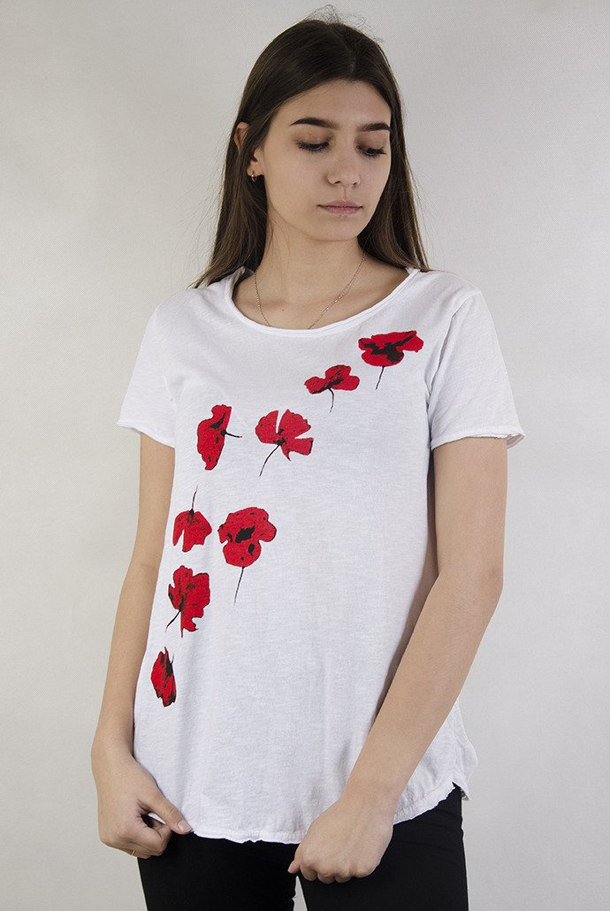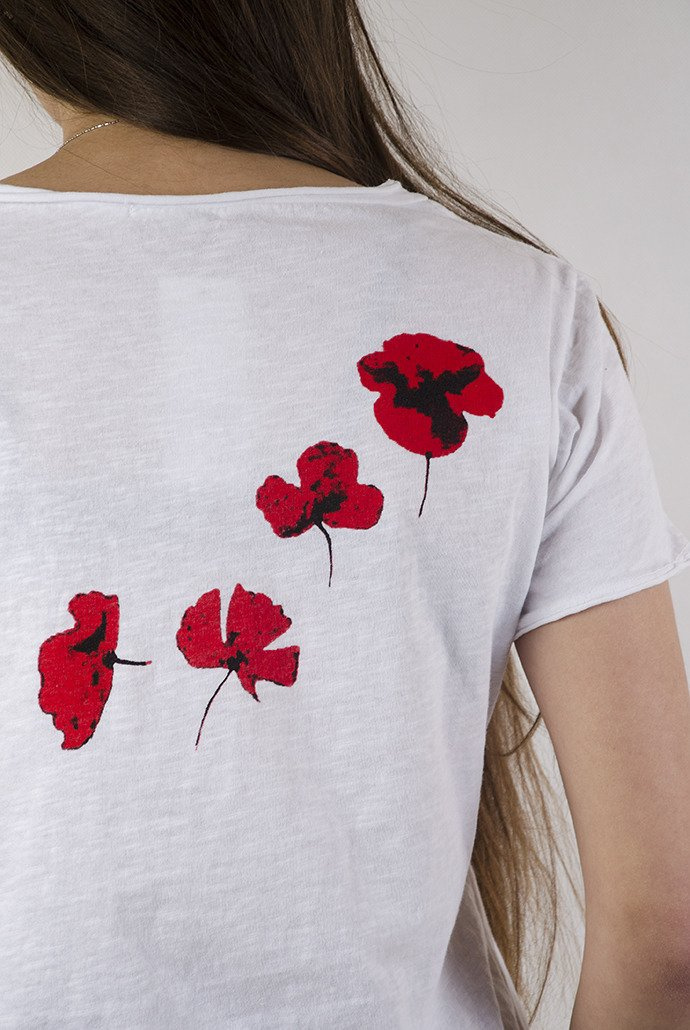 Biała bluzka w maki. Posiada nadruk zarówno z przodu jak i z tyłu.