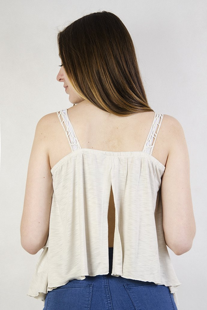 Beżowa bluzka z falbankami i ażurowymi zdobieniami.