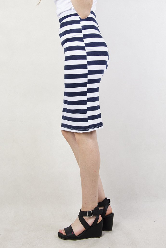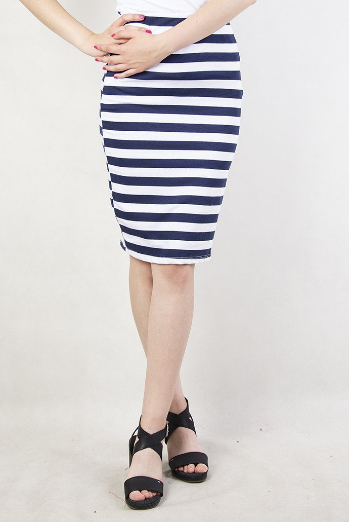 Biało-granatowa  dopasowana spódnica w szerokie paski.