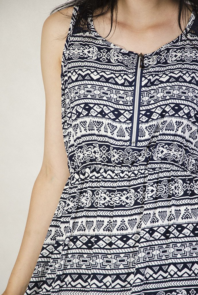 Wzorzysta,  sukienka z zamkiem przy dekolcie