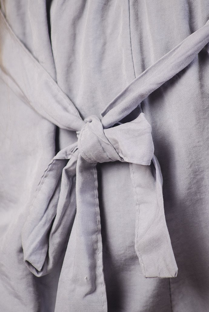 Szare zwiewne szorty z gumka w pasie oraz wiązaniem na wiele sposobów