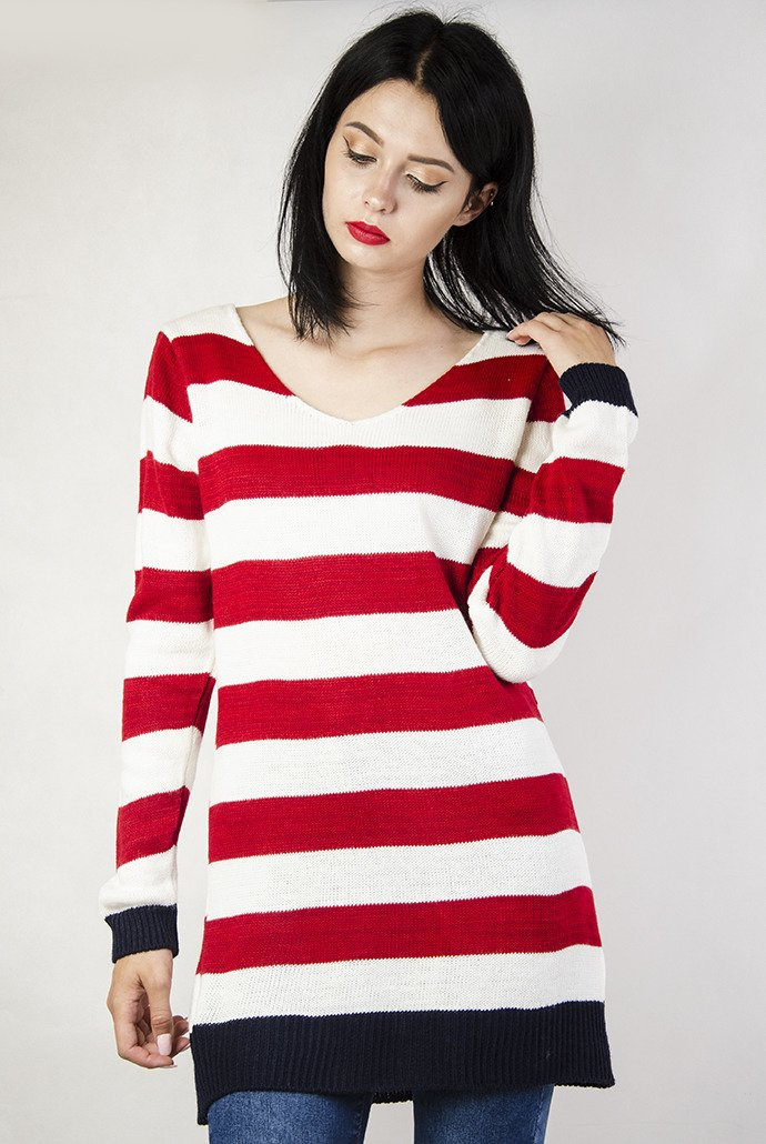 Biało-czerwony sweter ze wstążką.