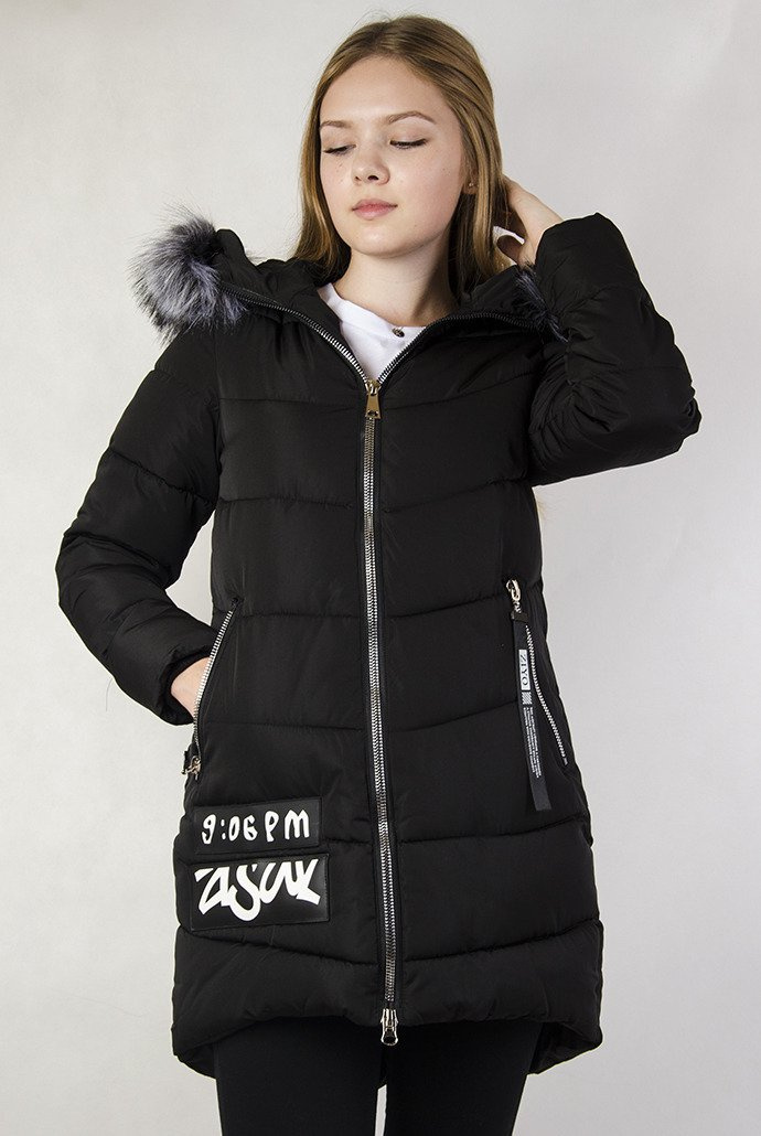 Czarna, pikowana, przedłużana kurtka z naszywkami.