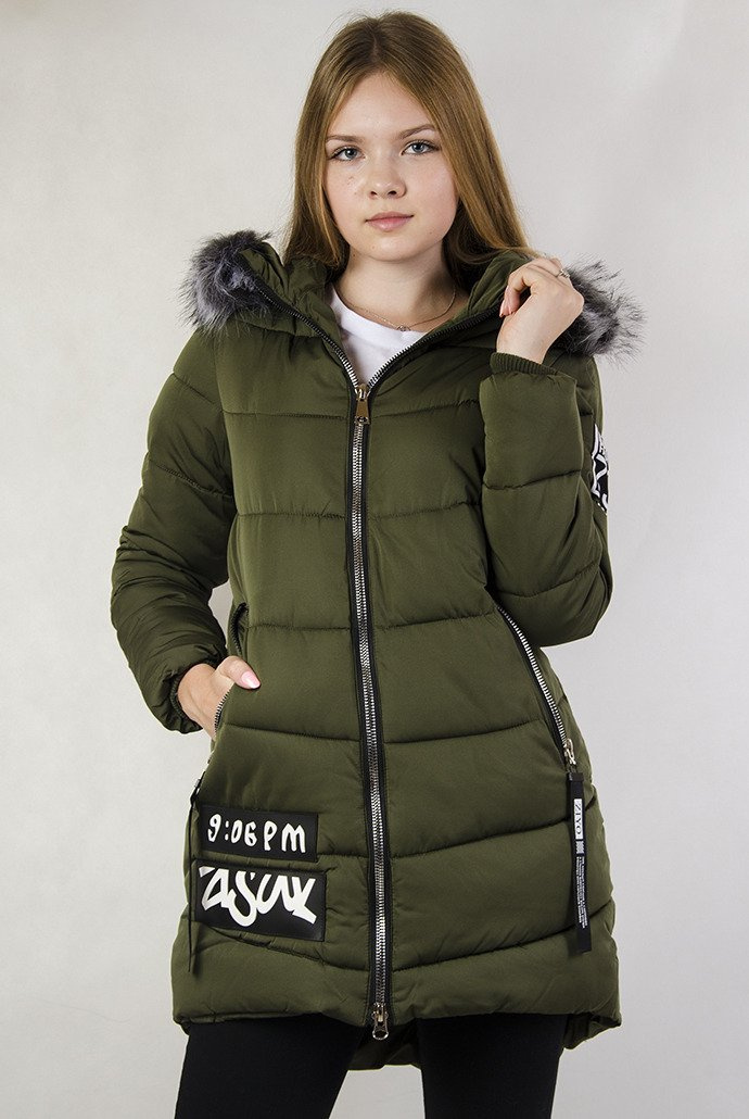 Zielona, pikowana, przedłużana kurtka z naszywkami.