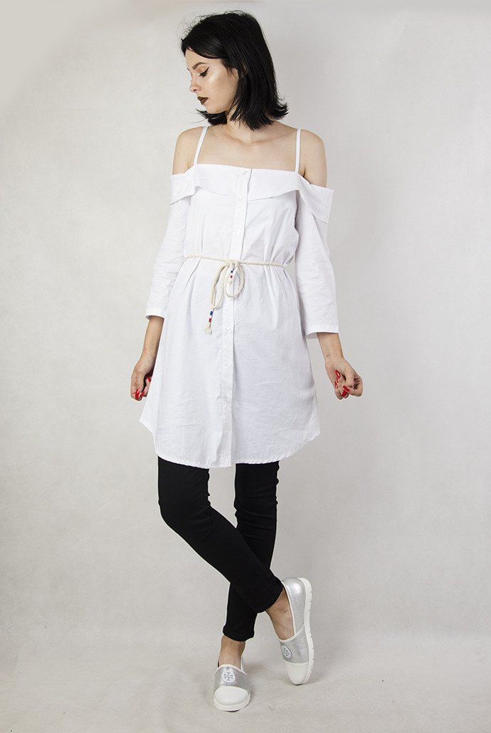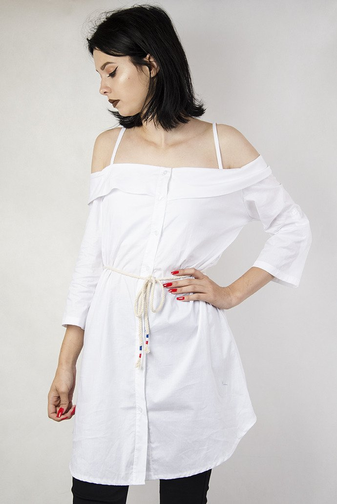 Przedłużana, biała koszula na ramiączka, posiada sznurek do wiązania w pasie.